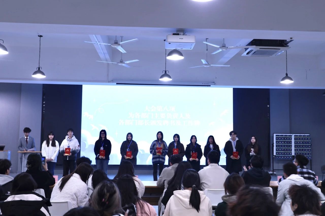 随后,员工会主席团成员为部门主要负责人及各部门部长颁发聘书及工作牌。接下来,部门主要负责人及各部门部长杨铭、曾繁红、胡丽阳、胡鑫、吕慧霖、李雨欣、黄乙姗同学轮流上台发言共同表达了对接下来做好员工会工作的信心与决心。