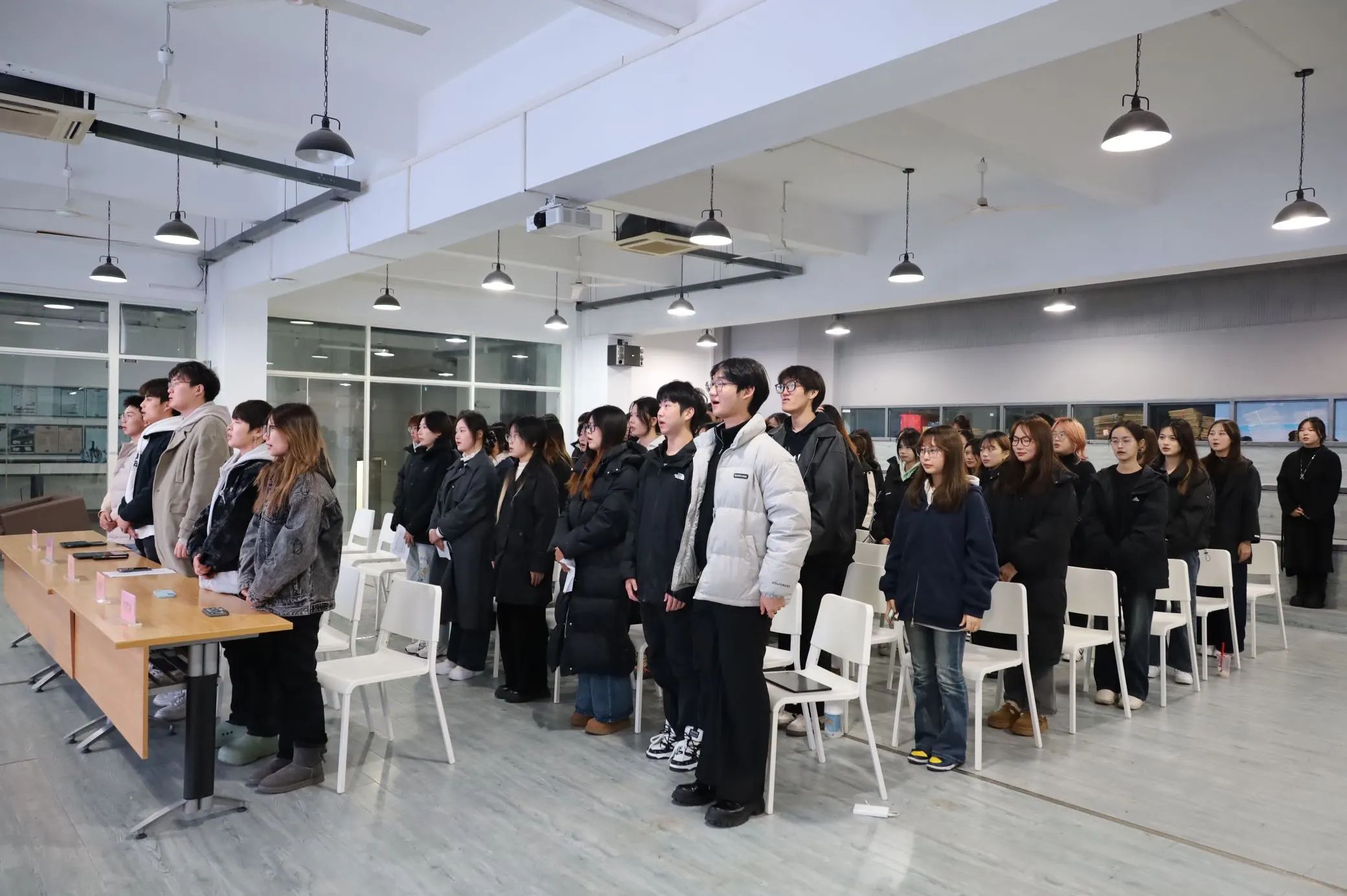 大会在主持人范畅和尹子涵同学的精彩开场中正式拉开帷幕。全体起立,奏唱中华人民共和国国歌,庄严的旋律回荡在会场,彰显着青年学子的爱国情怀与使命感。随后,分团委书记黄俊杰老师致辞,他强调团学干部应坚定理想信念,牢记职责使命,在服务同学的同时不忘学业提升,以青春的激情与汗水为分团委员工会书写崭新篇章,为同学们指明了前进的方向与奋斗的目标。