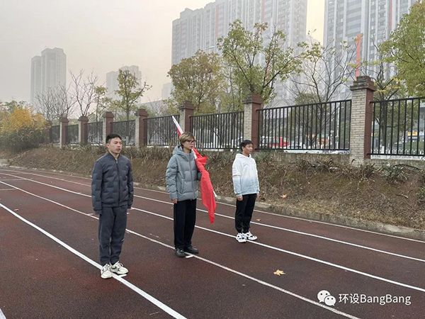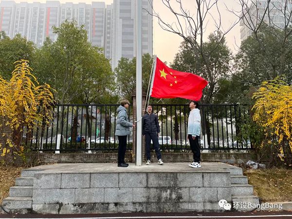 雄壮的《义勇军进行曲》响起,擎旗手振臂高挥,五星红旗在空中划出优美的弧线,冉冉升起,迎风飘扬。全体员工行注目礼,向五星红旗致以崇高敬意。